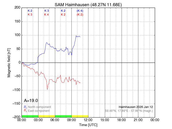 The scale on the vertical axis shows the intensity variation in nT, the horizontal axis shows UTC time.